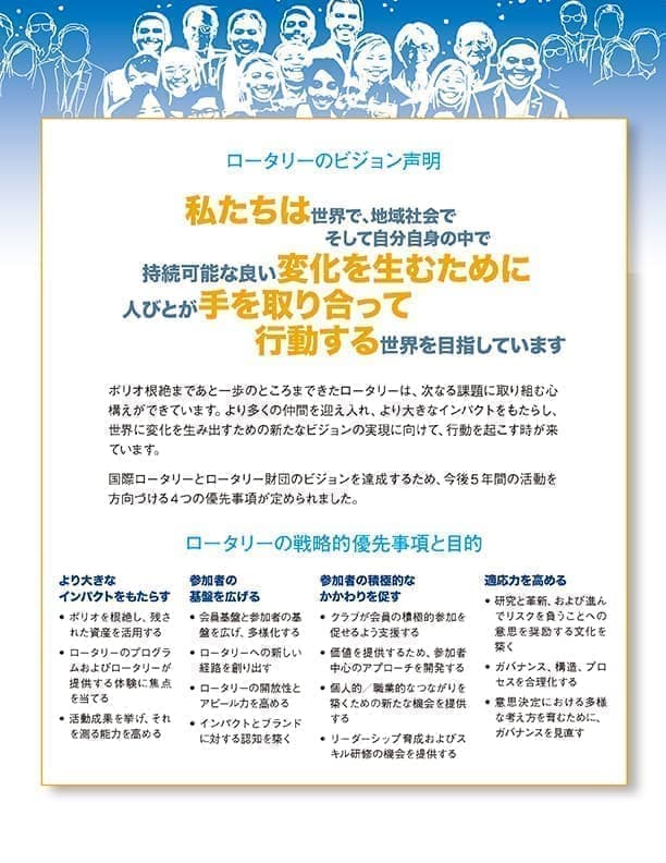 | 国際奉仕 | 国際奉仕は、世界中におけるロータリーの人道的な活動を広げ、世界理解と平和を推進する活動を含んでいます。ロータリーが世界平和と各国間の理解のために力となっている分野です。国際奉仕を通じて、世界中の人道的ニーズに取り組み、世界理解と親善、平和を推進します。 |