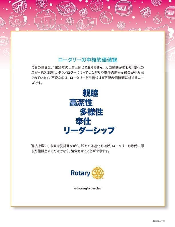 奉仕の理念で結ばれた職業人が、世界的ネットワークを通じて、国際理解、親善、平和を推進すること。